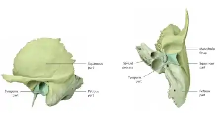 The flat portion of the temporal bone is the squamous portion. The zygomatic process helps to comprise the zygomatic arch. Through the space on the temporal bone is where the temporalis muscle traverses. The mastoid process is a conical prominence of the temporal bone behind the ear, to which neck muscles including the sternocleidomastoid muscle are attached, and which has air spaces linked to the middle ear. The styloid process is the site of attachment of the stylohyoid muscle as well as strands of the tongue. The serrated, jagged edge of the temporal bone on the inner portion of squamous portion contains bevels which Sutherland described as having motions similar to the gills of a fish.