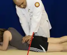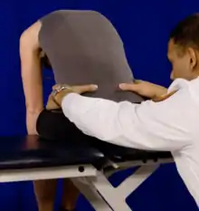 | The seated flexion test is performed to also determine laterality of sacroiliac dysfunction. It is done by having the patient seated on the exam table with the knees flexed to 90 degrees. The physician sits behind the patient with the eyes at the level of the pelvis and the thumbs on the PSIS. The patient is asked to bend forward. Ideally, the patient’s feet should be in contact with the ground while performing this test to avoid injury to the patient. As with the standing flexion test, the side that moves first and moves the furthest is the positive side, indicating sacroiliac restriction on the ipsilateral side. |  Seated flexion test |