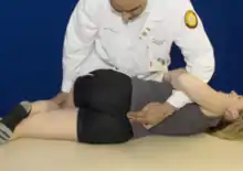 | Bilateral Flexion Shear: Place the patient in the prone position on the table. Abduct and internally rotate both lower extremities until the ilia are as laterally displaced as possible with respect to the sacrum. Contact the inferior lateral angles of the sacrum. Instruct the patient to perform 3 long, slow cycles of inhalation and exhalation. During the patient’s inhalation phase, apply firm downward pressure onto the inferior lateral angles. During the patient’s exhalation phase, actively resist sacral nutation. |  Bilateral Flexion Shear ME |