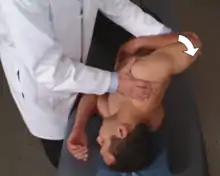| Adduction/External rotation | This coupled motion is assessed by having the patient’s arm flexed such that the elbow is in front of the chest with the wrist resting on the physician’s forearm as the physician adducts the shoulder |  6 - Shoulder Internal Rotation |