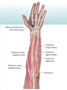 | Extensor carpi ulnaris | Dorsal surface of the fifth metacarpal | The patient is seated or lays supine. The wrist is passively extended, adducted, and ulnar deviation | E Add UD |  Extensor carpi ulnaris CS |