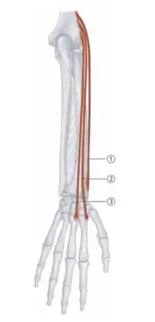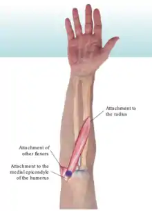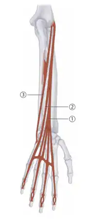 | Flexor carpi radialis | Palmar base of the second and third metacarpal | The patient is seated or lays supine. The wrist is passively flexed, abducted, and radially deviated | F Abd RD |  Flexor carpi radialis CS |