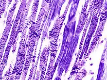 | .JPG.webp) Akuter Myokardinfarkt, H&E. |  Myokardinfarkt 7. Tag (Abräumphase), Sektionspräparat, H&E. | _PTAH.JPG.webp) Akuter Myokardinfarkt, Kontraktionsbanden- nekrosen, PTAH. |