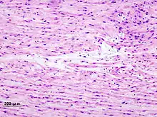 | _Victoria_blue-HE.jpg.webp) Thorakale Aortendissktion ohne Hinweis auf ein Marfan-Syndrom, OP-Präparat, Viktoriablau/H&E. | .jpg.webp) Idem, fokale myxoide Degeneration wie bei zystischer Medianekrose, H&E. |