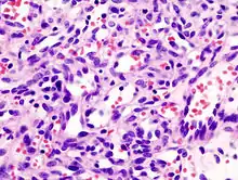 | .jpg.webp) Kapilläres Hämangiom der Haut, Hautbiopsie, H&E. | .jpg.webp) idem, stärkere Vergrößerung  | .jpg.webp) Kavernöses Hämangiom der Leber, Resektat, H&E. |