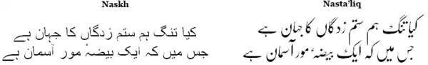 Nastaliq (sometimes written as nastalique, nastaleeq or nastaligh) is a flowing and stylized form of the Arabic alphabet which originated in then Persia (modern Iran) during the 14th and 15th centuries. Its origins lay in a combination of the Naskh and Ta'liq styles, hence the name "nastaliq". Since the Mughals ruled over Northern India at that time, a simplified version of nastaliq is still used for writing Urdu.