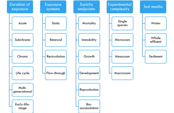 Aquatic toxicity tests can be divided into categories as described below and summarized in Figure 6.