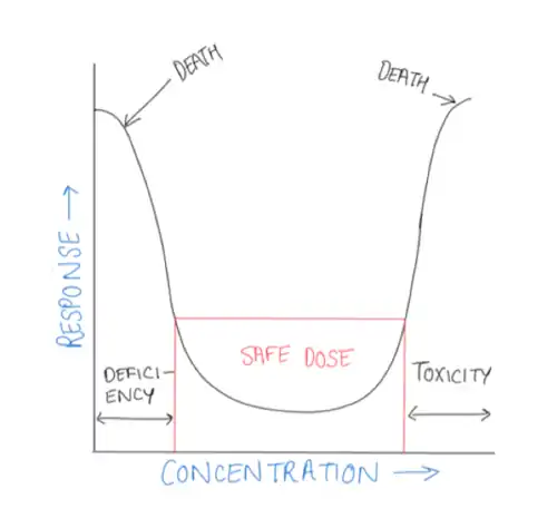 A non-standard toxicity curve is observed for essential chemicals such as water, oxygen, and vitamins. There is an optimal range for these chemicals: a very low concentration causes deficiency and death, and a very high concentration causes toxicity and death (see Figure 3). Another kind of non-standard toxicity curve is seen with chemicals found in such materials as plastics. These chemicals have different modes of action at different concentrations: they can disrupt hormones at low concentrations but not at high concentrations9. Some toxicity curves can be bimodal if males and females have different toxicity thresholds to a chemical.