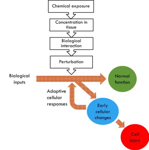 The intracellular effects of a chemical can also be described with the help of a toxicity pathway. It is a sequence of events, starting with a chemical entering an organism. A proportion of the chemical reaches the target tissue and interacts with it: for example, by binding to cell receptors on the tissue. This causes a perturbation, or disturbance, in normal cell function. If the cell starts to alter and the organism corrects the change in time, there will not be a problem; however, if the organism does not alter and effect change, the cell will be permanently altered/injured10 (see Figure 4).