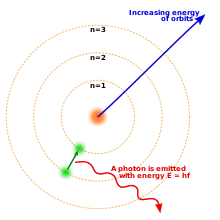 - As electron moves from a low potential energy level to a high potential energy level the difference in energy is used to emit Light of Quantum Energy or Photon Light