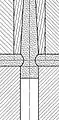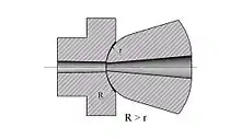 Section of a sprue bushing and barrel nozzle in contact, notice the difference between the two spherical radius and the two orifice diameters