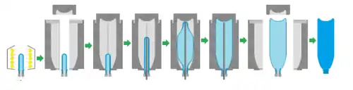 A plastic tube is heated up preparing to be inflated by gush of hot air. Later, the hot air pushes and expand the plastic against the mould to form the desired mould shapes. Once the plastics is cooled, the plastic is ejected from mould.