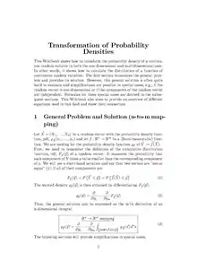 This Wikibook shows how to transform the probability density of a continuous random variable in both the one-dimensional and multidimensional case. In other words, it shows how to calculate the distribution of a function of continuous random variables. The first section formulates the general problem and provides its solution. However, this general solution is often quite hard to evaluate and simplifications are possible in special cases, e.g., if the random vector is one-dimensional or if the components of the random vector are independent. Formulas for these special cases are derived in the subsequent sections. This Wikibook also aims to provide an overview of different equations used in this field and show their connection.