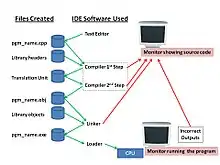 4. The linker opens the program object file and links it with the library object files as needed. Unless all linker items are resolved, the process stops and returns the user to the source code file within the text editor with an error message. If no problems are encountered it saves the linked objects as an executable file.