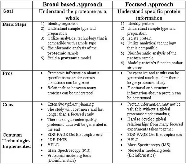 The first step when utilizing broad-based proteomics is to develop a hypothesis specific to the proteome being studied. It is best to choose organisms that already have a great deal of genomic information available, since the genome is always a useful supplement to proteomic information. Once the a hypothesis and organism are established, the proper technologies should be chosen; and these technologies should be compatible with whatever biological factors are present (i.e. sample type). Some important and relevant proteomic methods include HPLC, Mass Spectrometry, SDS-PAGE, two-dimensional gel electrophoresis, and perhaps in silico protein modeling.