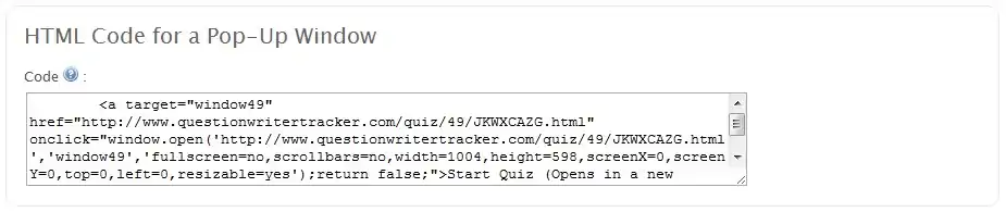 It's usually a good idea to use a pop-up window when linking to a quiz, as it will create maximum space, and removes the URL bar and the navigation buttons which can interfere with the quiz's own navigation. Question Writer Tracker generates HTML code to create a pop-up window for your quiz.