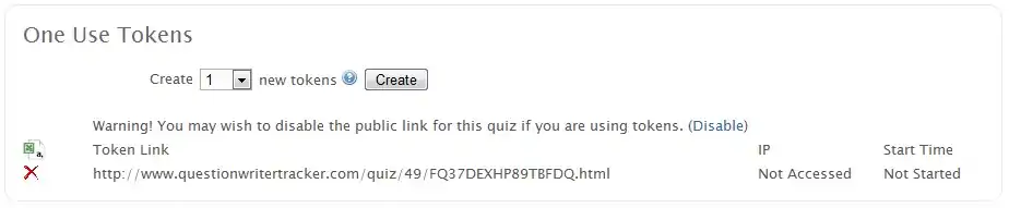 You'll notice a small Excel icon to the left above the list of tokens for each quiz. This is helpful to download your tokens (with links, ip addresses and start times) if you need to sort them or export them into another system.