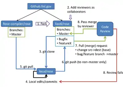 - When ready to push your commits, synchronize with the latest rose-compiler/master to resolve merge conflicts, etc.