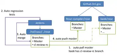 5. Configure Auto-syncs: Contact the Jenkins administrator (too1 and liao6) to have your repository added to a white-list of repositories to be synced whenever new commits are integrated into ROSE's official master branch.