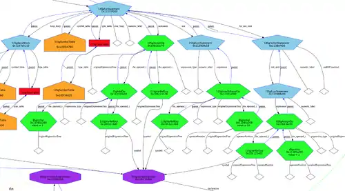 - dotGeneratorWholeASTGraph: whole AST graph showing more details. It provides filter options to show/hide certain AST information.