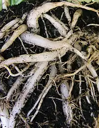 Proteoid roots or cluster roots: dense clusters of rootlets of limited growth that develop under low phosphate or low iron conditions in Proteaceae and some plants from the following families Betulaceae, Casuarinaceae, Elaeagnaceae, Moraceae, Fabaceae and Myricaceae.