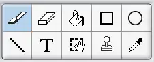 Navigate to the portion of the paint editor shown here. The buttons found on this toolbar, reading left to right top to bottom are: Paint Brush, Eraser, Fill Tool, Rectangle Tool, Ellipse Tool, Line Tool, Text Tool, Selection Tool, Stamp Tool, and the Eyedropper Tool. Here is a brief break down of what all these tools do.
