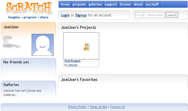 In order to share projects with others within the Scratch community, you must first sign up for a user account on the Scratch development team website: http://scratch.mit.edu/signup