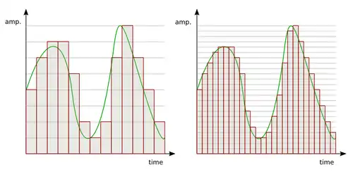 There is one more important factor to consider when considering the sampling process: bit depth. Bit depth represents the precision with which the amplitude is measured. In the same way that there are a limited amount of samples per second in a conversion process, there are also a limited amount of amplitude values for a sample point, and the greater the number, the greater the accuracy. A common bit resolution found in most standard digital audio systems (Hi-Fi, Compact Disc) is 16 binary bits which allows for a range of 65536 () individual amplitude values at a point in time. Lower bit values result in a greater distortion of the sound - a two bit system () only allows for four different amplitudes, which results in a massively inaccurate approximation of the input signal.
