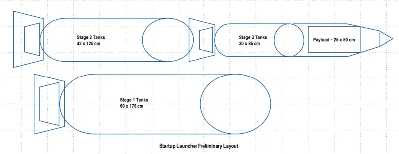 - Rocket stage tanks can share a common wall between fuel and oxidizer if they are fully sealed, and usually use an ellipsoidal dome with a 70% height ratio to minimize structural mass. We assume the payload has a density of 1 kg/liter, and thus requires 20 liters volume. For aerodynamic and structural reasons we want to keep the total vehicle height at 10 times the base diameter or less. Each combined stage tank can be modeled as two ellipsoidal domes plus a cylinder. Applying some geometry results in tank diameters of 60, 42, and 30 cm.