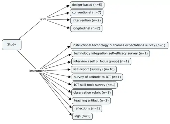 Findings regarding the type and purpose of the examined studies, and also the measurement instrument types used in these studies indicated that students’ self-reporting knowledge of TPACK was mostly measured in design-based and conventional settings rather than intervention and longitudinal. Moreover, self-report survey was the most commonly used instrument across studies for collecting data concerning students’ TPACK knowledge. Since there were several design-based studies, artifacts of students were also used by some studies as measurement tool.