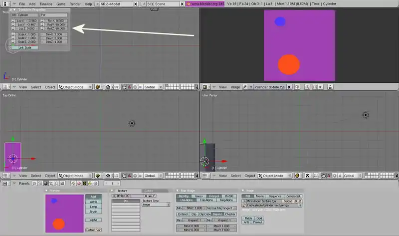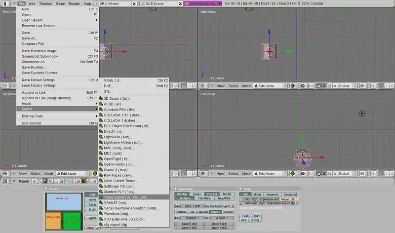 Step 12: Return to Object mode by pressing Tab ↹. Now it's time to export the object to Trainz. Go to the File menu and select Export\Trainz Export (im, km, pm).... Export the object to cylinder.im to match the sample kuid.  Copy the cylinder.im file, texture file and texture.txt file into a scenery object clone such as kuid:86627:1791 available on the DLS. The scenery object should show up in Trainz.