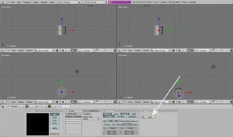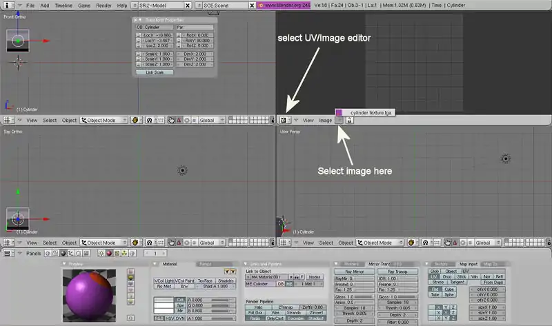 Step 7: Change one of the 3D display windows to UV/Image Editor and press the button immediately to the right of the Image button in order to select the texture file you just loaded.