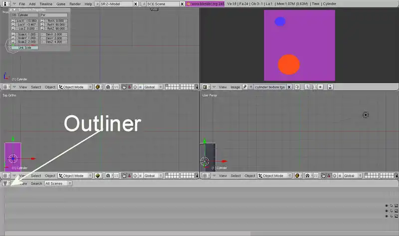 We are going to add more items to the scene and in order to select items easily in Blender we use the Outliner. Select Outliner from the Window type list (first button in the toolbar of the lower window). Bring up the Outliner, then press the View button in the Outliner's toolbar, then select Show Outliner.