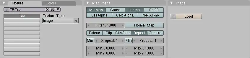 The dropdown menu should now display TE:Tex.001. Select Image from the Texture Type dropdown menu. The Map Image and Image panes will appear.
