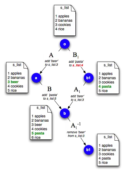 When Arjan records this change (adding beer), we produce a patch which tells us not only what contents Arjan added ("beer") but where he added them, namely to line 3 of s_list. We can say that in his repository, we have moved from context to context via a patch A. We can write this using a compact notation like or using the graphical representation below: