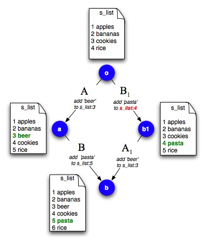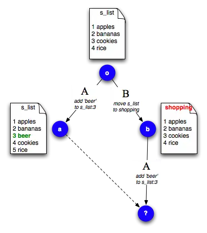 Consider a variant of the example above. As usual, Arjan adds beer to the shopping list. Next, he decides to add some pasta on line 5 of the file:
