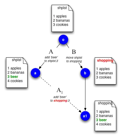 At this point in time, Ganesh decides that it would be useful if he got a copy of Arjan's changes. Roughly speaking we would like to pull Arjan's patch A into Ganesh's repository B. But, there is a major problem! Namely, Arjan's patch takes us from context to context . Pulling it into Ganesh's repository would involve trying to apply it to context , which we simply do not know how to do. Put another way: Arjan's patch tells us to add a line to file s_list; however, in Ganesh's repository, s_list no longer exists, as it has been moved to shopping. How are we supposed to know that Arjan's change (adding the line "beer") is supposed to apply to the new file shopping instead?
