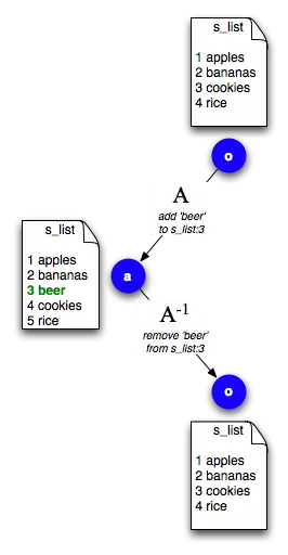So above, we said that Arjan has created a patch which adds beer to the shopping list, passing from context to , or more compactly, . Now we are going to create the inverse patch , which removes beer from the shopping list and brings us back to context . In the compact context-patch notation, we would write this as . Graphically, we would represent the situation like this: