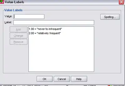 For each row of our table at top, enter Old Values on the left, New Values on the right and click “Add”. That will put them into the “Old → New” list. As you can see, our screenshot shows original values 0 through 3 have been recoded as “1.” Values 4 through 8 have been recoded as “2” in the new variable. These recodings could have also been specified as ranges, by selecting the radio button next to “Range” and entering a range of source values.