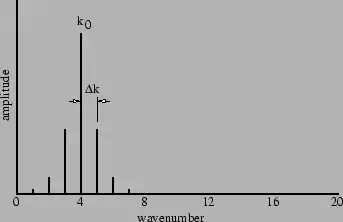 We can symbolically represent the sine waves that make up figures 1.5, 1.6, and 1.7 by a plot such as that shown in figure 1.8. The amplitudes and wavenumbers of each of the sine waves are indicated by vertical lines in this figure.