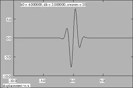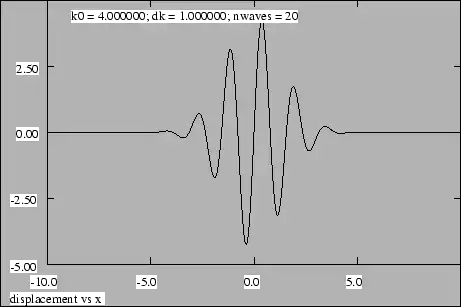 The quantity controls the distribution of the sine waves being superimposed -- only those waves with a wavenumber within approximately of the central wavenumber of the wave packet, i. e., for in this case, contribute significantly to the sum. If is changed to , so that wavenumbers in the range contribute significantly, the wavepacket becomes narrower, as is shown in figures 1.11 and 1.12.