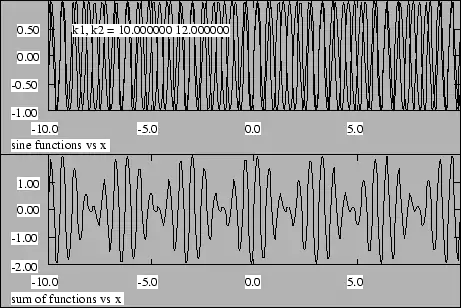 Figure 1.7: Superposition of two sine waves with equal amplitudes and wavenumbers and .