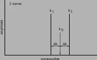 Thus, as we observed in the earlier examples, the length of the wave packet is inversely related to the spread of the wavenumbers (which in this case is just the difference between the two wavenumbers) of the component waves. This relationship is central to the uncertainty principle of quantum mechanics.