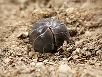 The Striped Woodlouse is shiny with a dark mid-line and dark head. The Common Pill Woodlouse has a tail shield (telson) that can be rounded or triangular in shape.