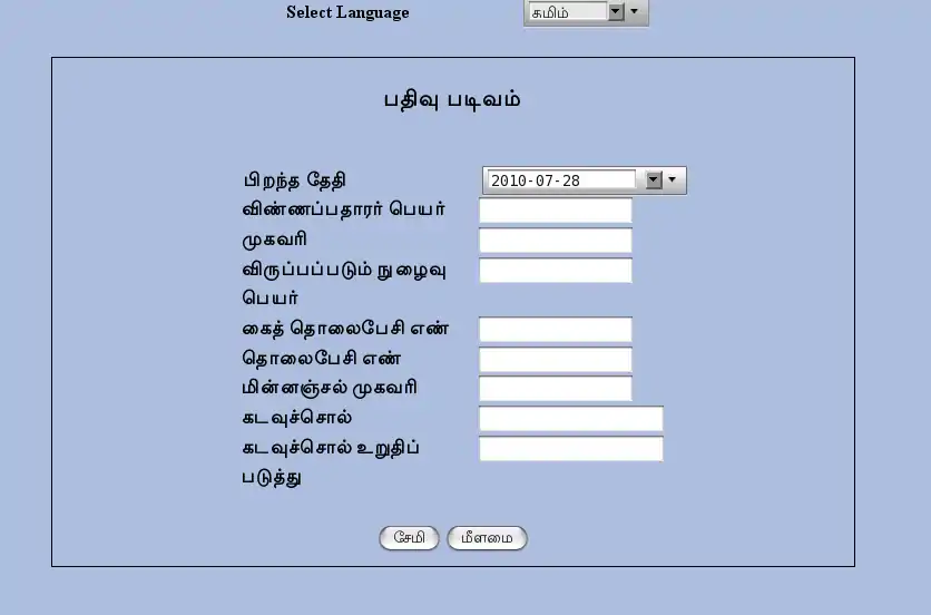 <lang name="தமிழ்" rname="பதிவு படிவம்" smessage="பதிவு சேமிக்கப்பட்டது"