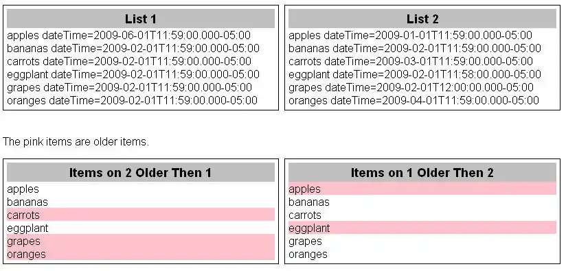 You have two identical lists of items with timestamps. You want to compare the items to see what items are newer.