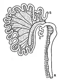 Fishes.—In the Cyclostomata, Holocephali and a few Teleostei the course of the gut is practically straight from the pyloric end of the stomach to the exterior, and there is no marked differentiation into regions. In the Dipnoi, a contracted sigmoid curve between the stomach and the dilated intestine is a simple beginning of the complexity found in other groups. In very many of the more specialized teleosteans, the gut is much convoluted, exhibiting a series of watchspring-like coils. In a number of different groups, increased surface for absorption is given, not by increase in length of the whole gut, but by the development of an internal fold known as the spiral valve. This was probably originally a longitudinal fold similar to the typhlosole of chaetopods. It forms a simple fold in the larval Ammocoete, and in its anterior region remains straight in some adult fish, e.g. Polypterus, but in the majority of cases it forms a complex spiral, wound round the inner wall of the expanded large intestine, the internal edge of the fold sometimes meeting to form a central column. It occurs in Cyclostomata, Selachii, Holocephali, Chondrostei, Crossopterygii, Amiidae, Lepidosteidae and Dipnoi. A set of organs peculiar to fish and known as the pyloric caeca are absent in Cyclostomata and Dipnoi, in most Selachii and in Amia, but present, in numbers ranging from one to nearly two hundred, in the vast majority of fish. These are outgrowths of the intestinal tract near the pyloric extremity of the stomach, and their function is partly glandular, partly absorbing. In a few Teleostei there is a single caecal diverticulum at the beginning of the “rectum,” and in the same region a solid rectal gland occurs in most elasmobranchs, whilst, again, in the Dipnoi a similar structure opens into the cloaca. These caeca have been compared with the colic caeca of higher vertebrates, but there is yet no exact evidence for the homology.