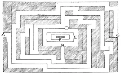 We will now pass to the interesting subject of how to thread any maze. While being necessarily brief, I will try to make the matter clear to readers who have no knowledge of mathematics. And first of all we will assume that we are trying to enter a maze (that is, get to the "centre") of which we have no plan and about which we know nothing. The first rule is this: If a maze has no parts of its hedges detached from the rest, then if we always keep in touch with the hedge with the right hand (or always touch it with the left), going down to the stop in every blind alley and coming back on the other side, we shall pass through every part of