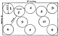 Here is an interesting little puzzle suggested to me by Mr. W. T. Whyte. Mark off on a sheet of paper a rectangular space 5 inches by 3 inches, and then find the greatest number of halfpennies that can be placed within the enclosure under the following conditions. A halfpenny is exactly an inch in diameter. Place your first halfpenny where you like, then place your second coin at exactly the distance of an inch from the first, the third an inch distance from the second, and so on. No halfpenny may touch another halfpenny or cross the boundary. Our illustration will make the matter perfectly clear. No. 2 coin is an inch from No. 1; No. 3 an inch from No. 2; No. 4 an inch from No. 3; but after No. 10 is placed we can go no further in this attempt. Yet several more halfpennies might have been got in. How many can the reader place?