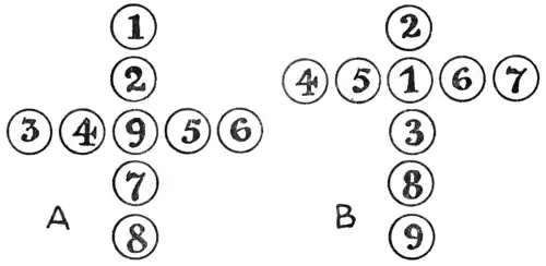 All that we need for this puzzle is nine counters, numbered 1, 2, 3, 4, 5, 6, 7, 8, and 9. It will be seen that in the illustration A these are arranged so as to form a Greek cross, while in the case of B they form a Latin cross. In both cases the reader will find that the sum of the numbers in the upright of the cross is the same as the sum of the numbers in the horizontal arm. It is quite easy to hit on such an arrangement by trial, but the problem is to discover in exactly how many different ways it may be done in each case. Remember that reversals and reflections do not count as different. That is to say, if you turn this page round you get four arrangements of the Greek cross, and if you turn it round again in front of a mirror you will get four more. But these eight are all regarded as one and the same. Now, how many different ways are there in each case?
